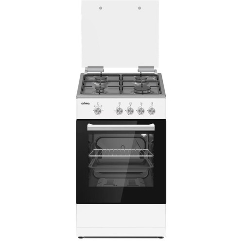 4 Queimadores a gás Mesa de trabalho em Inox Válvulas Segurança Total 2 grelhas esmaltadas Forno a gás Volume útil do forno: 54 L Grelhador a Gás Porta amovível com vidro duplo Grelha e tabuleiro de recolha de molhos Tampo em Vidro Preparado para gás butano/propano Inclui kit de injetores para gás natural Cor: Branco Dimensões: A855xL500xP630mm
