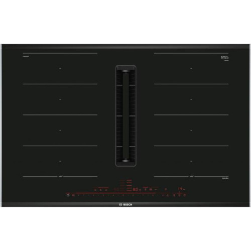 SER8, Placa FlexInduction c/ ventilação integrada, 80 cm, Comfort Design, 2 zonas Flex, DirectSelect Premium, HC (conexão placa-exaustor), MoveMode, PowerTransfer, PerfectFry, PerfectCook, PowerBoost, PanBoost, Manter quente, programação do tempo, ReStart, QuickStart, ind. consumo energia, Exaustor - no centro da placa, motor EcoSilenceDrive, sensor PerfectAir, 622m3/h, Classe B A|-|B|69dB. O exaustor apenas funciona com a instalação de acessório opcional. (ver acessórios)